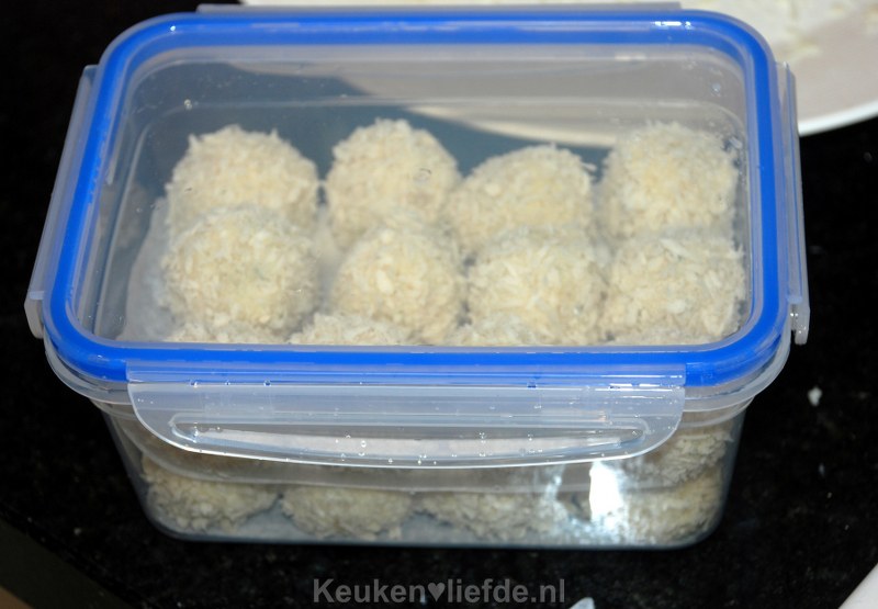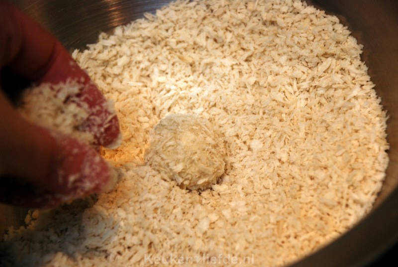 Klop het eiwit lichtjes op, maar niet schuimig. Zet drie diepe borden of kommen klaar met bloem, losgeklopt eiwit en broodkruim of panko. Wentel de balletjes eerst door de bloem, dan het ei en daarna door het broodkruim.