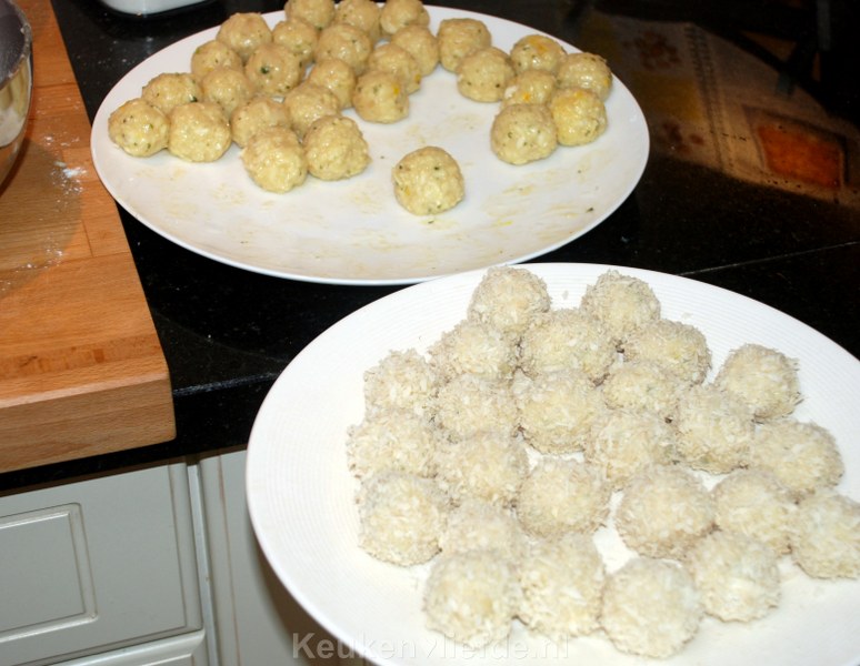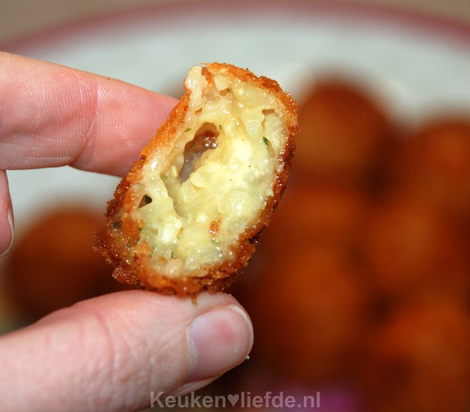 Snijd de mozzarella in piepkleine blokjes. Maak je handen vochtig onder de koude kraan en pak een klein beetje risotto in je hand. Draai er met je handen een rond balletje van ter grootte van een flinke walnoot en druk er een klein stukje mozzarella in. Draai nog even verder zodat de mozzarella goed bedekt is met risotto. Leg het balletje op een bord en ga zo verder totdat alle risotto op is. Maak regelmatig je handen even vochtig met koud water om te voorkomen dat de rijst blijft plakken.