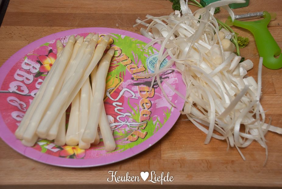 Snijd circa 1,5 cm van de onderkant van de asperges en schil de asperges met een aspergeschiller. Snijd de asperges in gelijke stukken van circa 2 cm. Bewaar de aspergeschillen en uiteinden.
