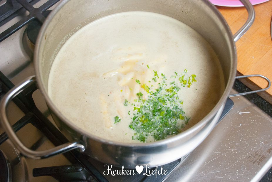 Giet de bouillon door een fijne zeef en doe de gezeefde bouillon weer terug in de kookpan. Voeg de aspergestukjes en aardappelblokjes toe en kook in circa 15 minuten zachtjes gaar. Haal de pan van het vuur en schep een klein gedeelte van de aardappel en asperges uit de soep. Pureer de rest van de soep en voeg daarna de stukjes aardappel en asperges weer toe. Zet de pan terug op laag vuur en maak de soep af met de kookroom en peterselie.