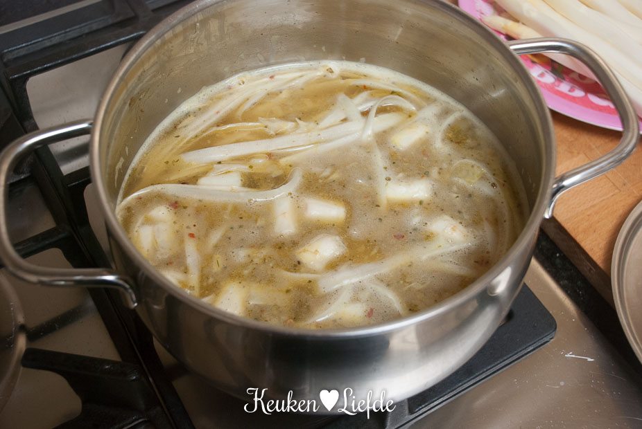 Giet de bouillon door een fijne zeef en doe de gezeefde bouillon weer terug in de kookpan. Voeg de aspergestukjes en aardappelblokjes toe en kook in circa 15 minuten zachtjes gaar. Haal de pan van het vuur en schep een klein gedeelte van de aardappel en asperges uit de soep. Pureer de rest van de soep en voeg daarna de stukjes aardappel en asperges weer toe. Zet de pan terug op laag vuur en maak de soep af met de kookroom en peterselie.