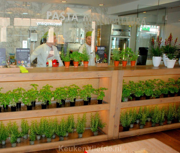 Als je binnenstapt in het enorme pand (900 m2) zie je direct waar het bij Vapiano om draait: versheid. Overal staan potjes met verse basilicum en rozemarijn en recht tegenover de entree ligt de open ‘manifattura’: de plek waar de pasta gemaakt wordt.