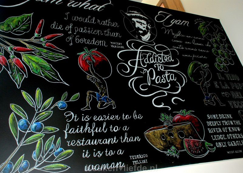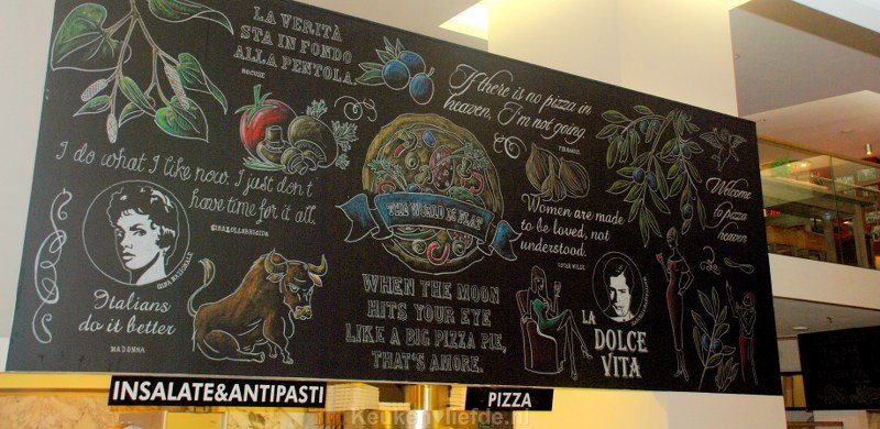 Nadat we onze eigen cappuccino gemaakt en opgedronken hebben, dalen we de joekel van een trap af naar de kelder, dat tevens het restaurantgedeelte is. Hier vallen direct de immens grote krijtborden op, met kleurrijke tekeningen, spreuken en teksten gerelateerd aan Vapiano. Deze ‘kunst’ wordt speciaal voor alle Vapiano’s wereldwijd op maat gemaakt. Een genot om naar te kijken.