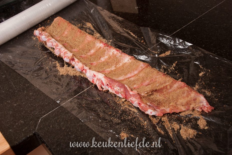 Wrijf de spareribs royaal in met het kruidenmengsel. Wikkel de spareribs goed in vershoudfolie en laat een nacht marineren in de koelkast.