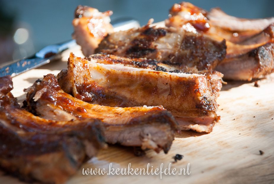 - 2 kg rauwe, ongemarineerde spareribs, zilverkleurige vlies aan de onderkant van de ribben verwijderd (de slager heeft dit vaak al verwijderd)