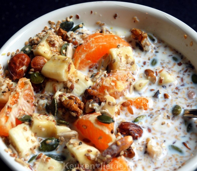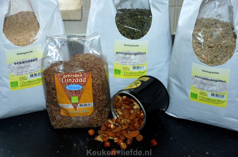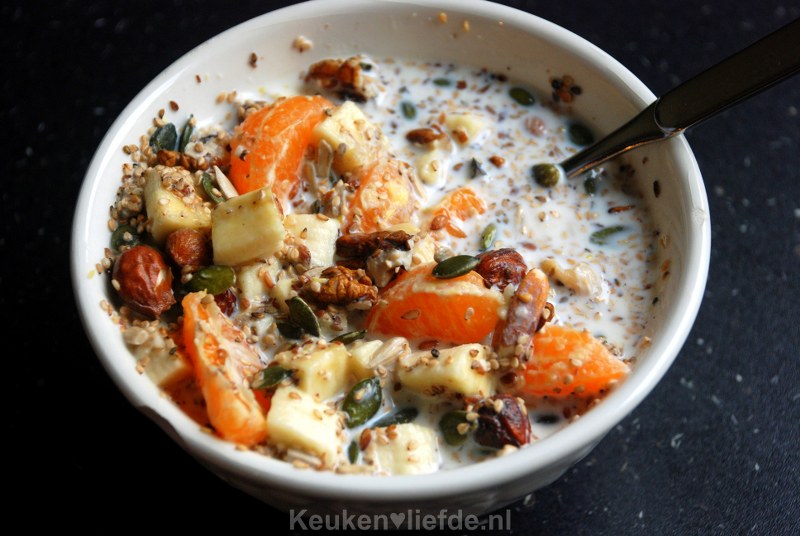 Inmiddels eet ook mijn vader geen brood meer als ontbijt. Bovenstaande foto nam ik enkele dagen geleden van zijn ‘powerontbijt’, zoals hij het zelf noemt. Voor dit ontbijt vormen rauwe noten en zaden* de perfecte basis. Je kunt het puur eten, maar wil je het smakelijker maken, voeg er dan fruit aan toe (het beste zijn blauwe bessen** en frambozen) en eventueel – bij voorkeur volle – zuivelproducten, zoals melk, yoghurt en kwark. Beter nog zijn bijvoorbeeld kokosmelk en amandelmelk.***