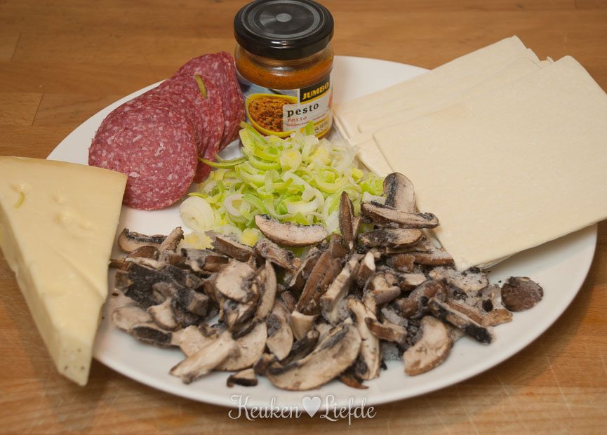 Verwarm de oven voor op 220 graden. Leg de plakjes bladerdeeg tegen elkaar aan, op een met bakpapier bekleed bakblik en druk de naden dicht. Bestrijk de bovenkant met pesto (laat de randen vrij) en bestrooi met de geraspte kaas. Beleg verder met de plakjes salami, prei en champignons en bak circa 20 minuten in de oven, of totdat de kaas gesmolten is en de randen goudbruin zijn.