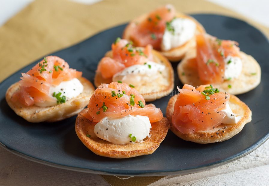 Warm de blini’s kort op in de oven of koekenpan. Beleg de blini’s met een theelepeltje crème fraîche, een stukje gerookte zalm en garneer met bieslook en zwarte peper.