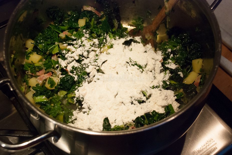 Smelt de boter in een pan en voeg de prei, sjalot, knoflook, aardappel, ontbijtspek en boerenkool toe. Fruit op laag tot middelhoog vuur aan, totdat de boerenkool is geslonken. Verkruimel de bouillontabletten erover en voeg de bloem toe. Bak circa 1 minuut, al roerend, op laag vuur verder om de bloem te garen. Blus af met de witte wijn en laat even inkoken. Voeg 1,25 liter koud water toe en breng aan de kook. Zet dan het vuur laag, voeg de rookworst toe en laat de soep circa 15 minuten zachtjes pruttelen, of totdat de aardappel zacht is.