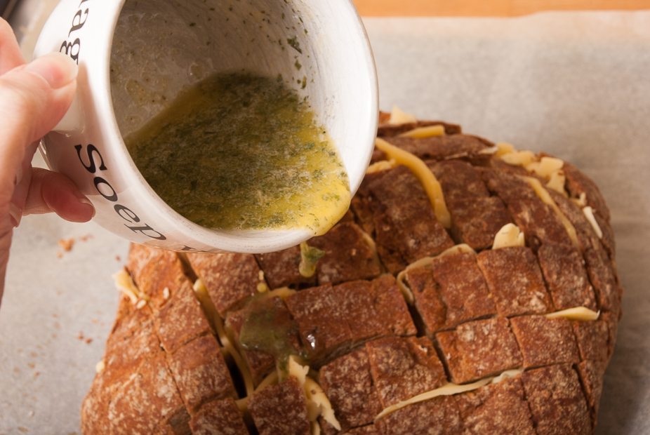 Verwarm de oven voor op 180 graden Celsius. Snijd het brood met een scherp broodmes in een ruitjespatroon, niet helemaal doormidden snijden. Duw de plakken kaas tussen de gleuven. Smelt de roomboter in de magnetron en meng met de kruidenmix en knoflook. Schenk de gesmolten boter over het borrelbrood. Zorg ervoor dat het goed tussen de gleuven komt. Bedek het borrelbrood met aluminiumfolie en bak circa 15 tot 20 minuten in de oven.