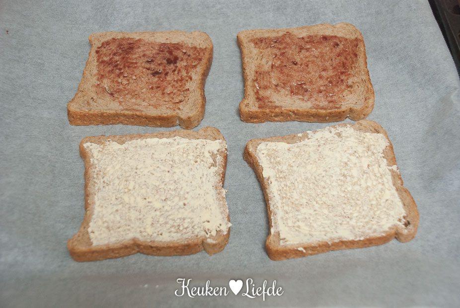 Verwarm de oven voor op 200 graden. Besmeer aan één kant twee boterhammen met boter en twee boterhammen met (weinig) jam. Beleg twee boterhammen op de jamzijde met brie en leg de andere boterham erbovenop, boterkant naar boven.