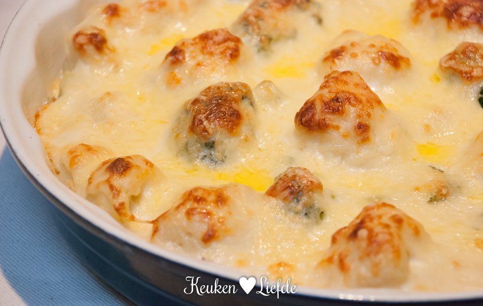 De kleine broccoli en bloemkool wilde ik een beetje pimpen. Maar hoe? Voordat ik mezelf die vraag gesteld had, dreef er al een zee van kaassaus voor mijn blauwe oogjes. (Ik heb het al aan talloze dokters gevraagd, maar genezing van de Rozekaasbrilziekte is onmogelijk. Help.) De kale groenten overgoot ik daarom rijkelijk met romige kaassaus en gratineerde ik in de oven. Dit is pimpen à la KeukenLiefde: gezond en een tíkkeltje ondeugend. Heerlijk!