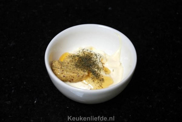 Voor de zelfgemaakte dillesaus meng je wat mayonaise, mosterd, honing en dille door elkaar heen et voila! De rest laat ik aan jullie verbeelding over… 🙂