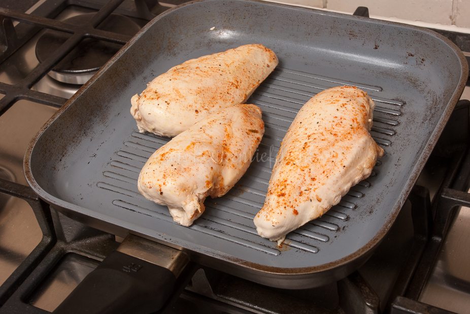 Verhit de grillpan en laat heet worden. Smeer de kipfilets in met wat olie en bestrooi met zout en peper (ik gebruikte cajunkruiden). Gril de kipfilets aan beide kanten, totdat ze mooie grilstrepen hebben. Niet langer grillen dan nodig is — de kip is al gaar en anders wordt hij droog. Leg de kip op een snijdplank en laat even rusten.