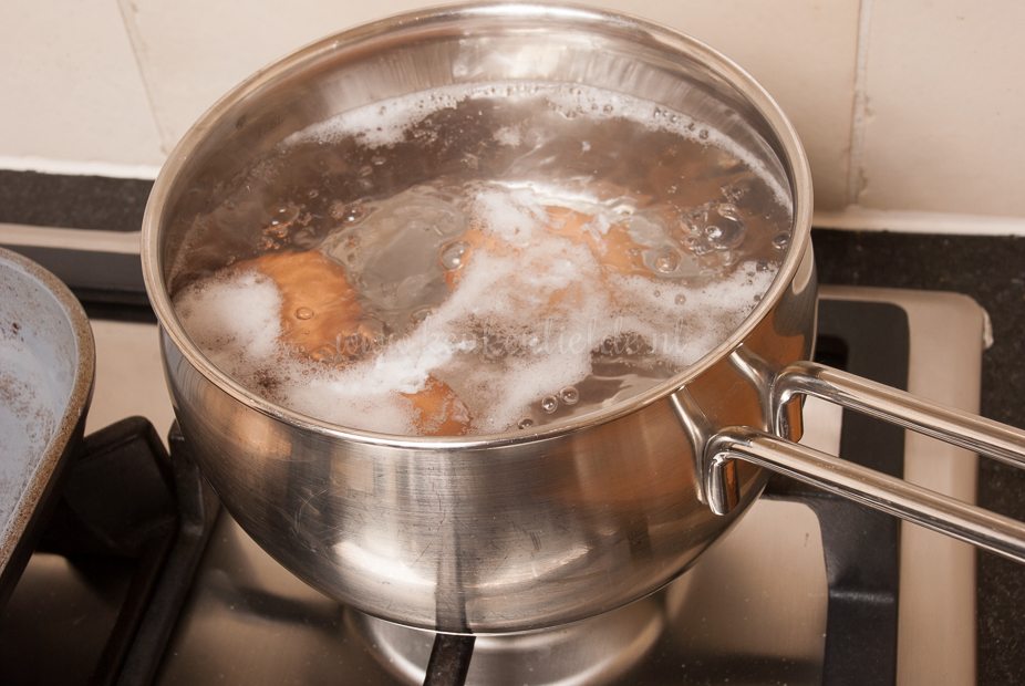 Kook ondertussen de eieren hard. Pel en snijd in plakjes. Bak de broodjes af volgens de omschrijving op het pak.