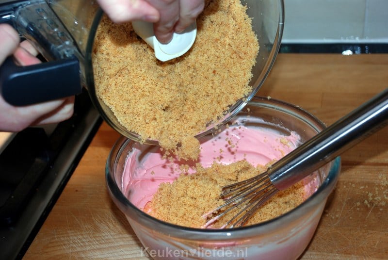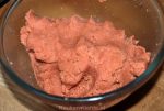 Bak een basis cake en laat deze volledig afkoelen. Vermaal de cake tot kruimels in de keukenmachine en meng de botercrème erdoor (ik kleurde de botercrème roze met een paar druppels rode levensmiddelenkleurstof).