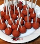 Voeg zoveel botercrème toe, totdat je een stevig deeg hebt waar je makkelijk balletjes van kunt draaien. Schep steeds met een theelepel wat deeg op je hand, zodat de balletjes allemaal dezelfde grootte krijgen. Prik in ieder balletje een cakepop-stokje en laat de cakepops opstijven in de koelkast. Je kunt de cakebolletjes met gaatjes en zonder stokje ook invriezen en een andere keer verder afmaken. Ik vroor de cakepops in. Zo kun je het maken van de cakepops verspreiden over meerdere dagen, wat het minder intensief maakt.