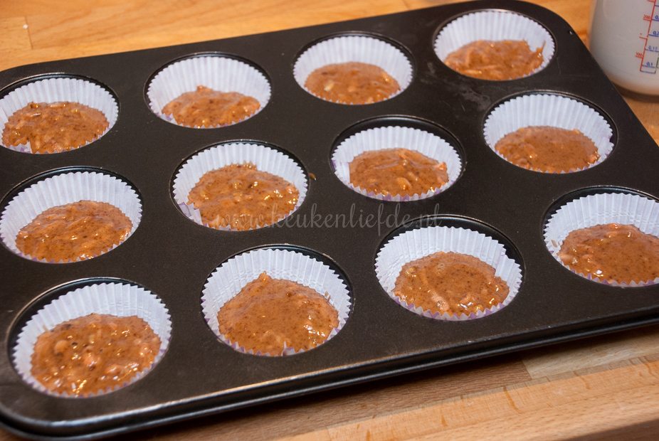 Verwarm de oven voor op 175 graden. Vet het bakblik in en vul met de papieren vormpjes.