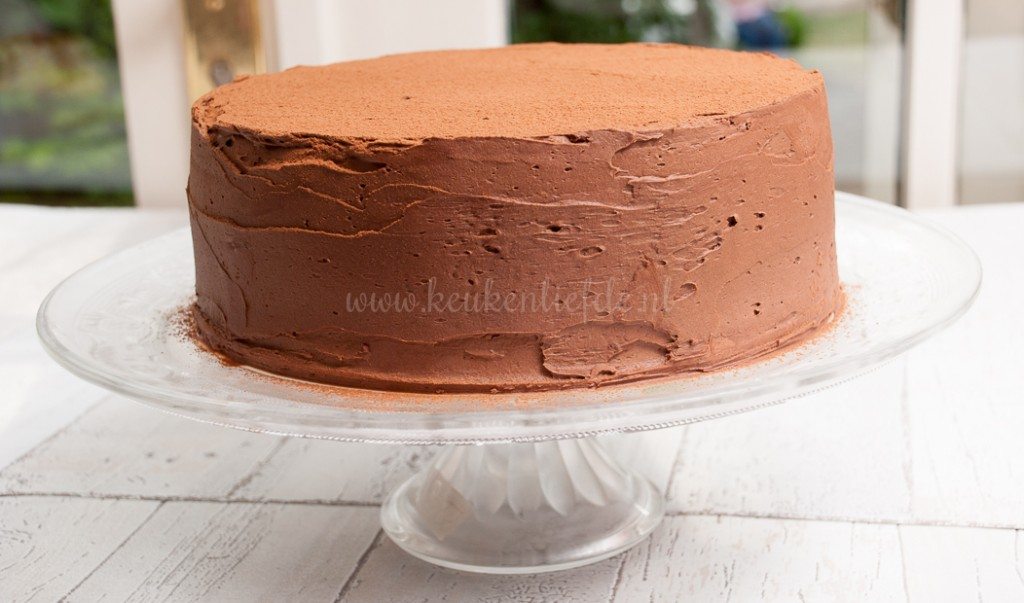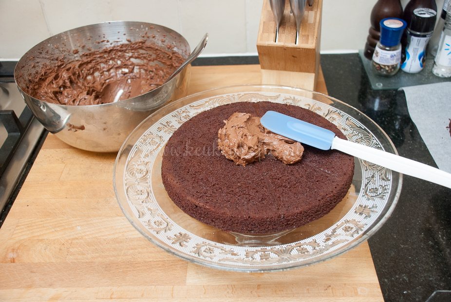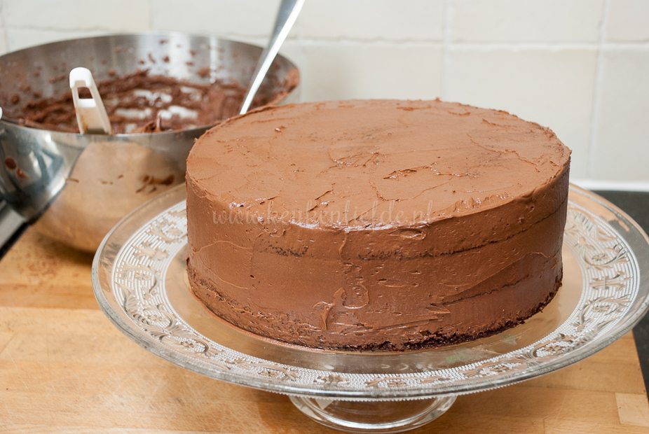 Het is handig om de taart in twee (of zelfs 3) fases af te smeren. Breng eerst rondom een dun laagje chocoladecrème en laat opstijven in de koelkast. Met dit eerste laagje kun je alle oneffenheden in de taart wegwerken. Werk daarna de taart strak en glad af met de overige crème.
