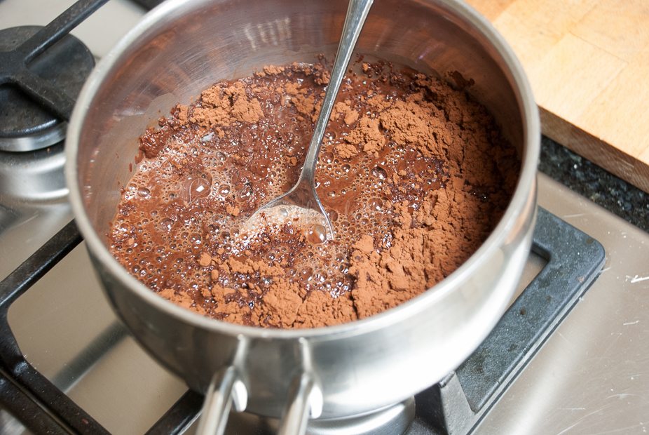 Breng in een pannetje het water aan de kook en los de cacao erin op. Laat afkoelen.