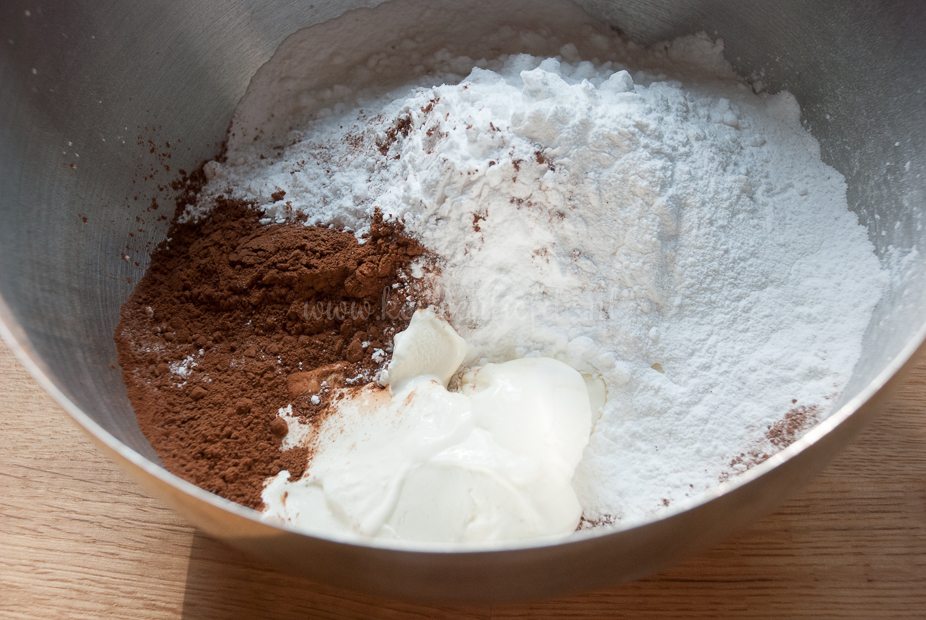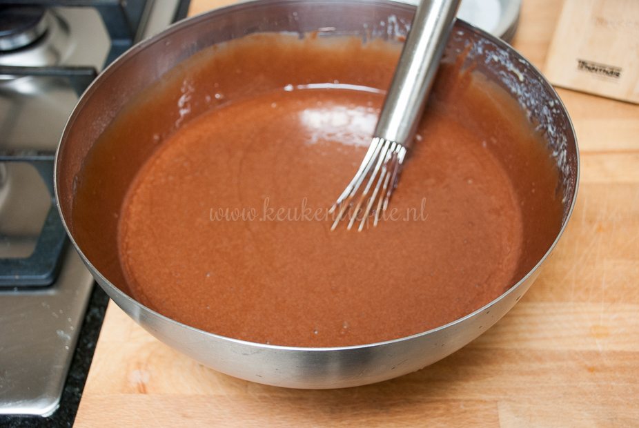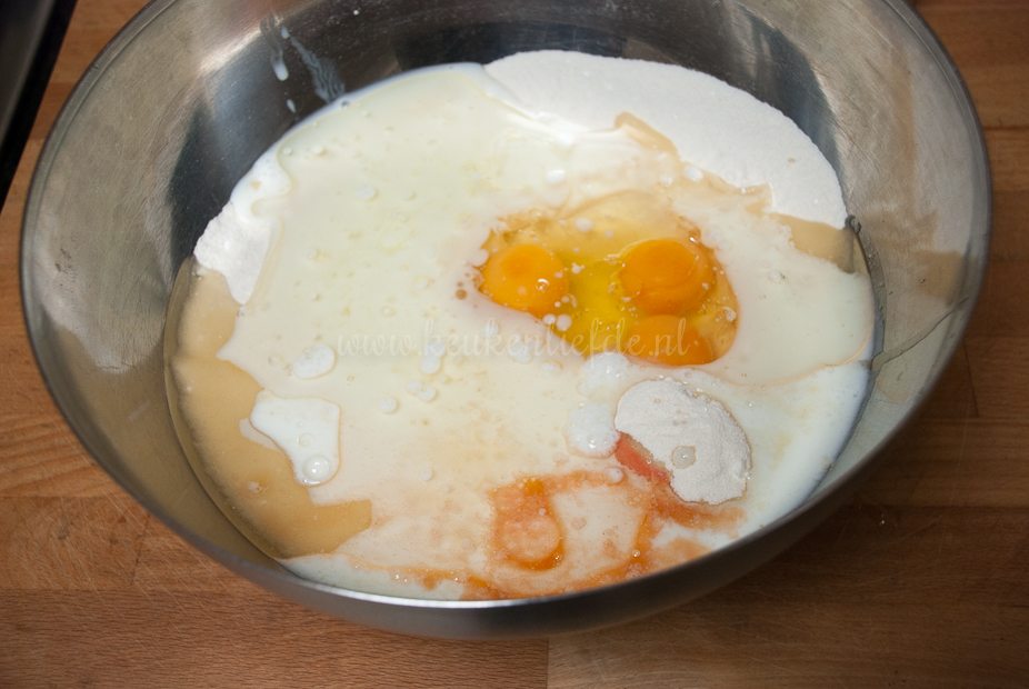 Meng in een kom de bloem, suiker, zout en bakpoeder door elkaar. Voeg de vanille-extract, karnemelk, zonnebloemolie en de eieren toe en klop door het beslag. Roer nu ook het cacaomengsel door het beslag. Laat het beslag een uur rusten.