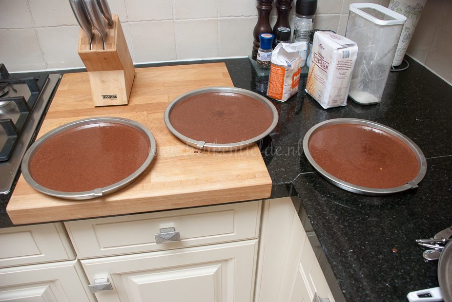 3 springvormen van 24 cm doorsnede (ik gebruikte 3 boterkoekvormen), boter om in te vetten, 3 vellen bakpapier