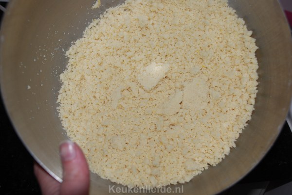 Verwarm de oven voor op 170 graden en bekleed het bakblik met een vel bakpapier. Meng voor de bodem de boter (in kleine blokjes en niet zo’n homp als op de foto…), suiker en bloem met de handmixer door elkaar tot er een soort broodkruimels ontstaan.