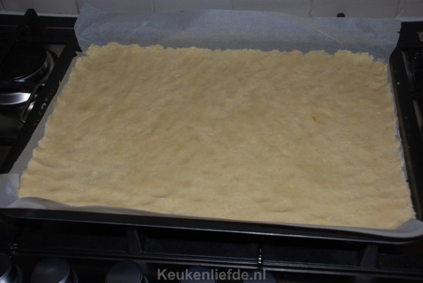 Heb geduld, want dit kan best even duren. Druk de kruimels in het bakblik goed aan zodat je een mooie bodem krijgt en bak de bodem ongeveer 20 minuten in de oven totdat hij heel licht gaat kleuren.