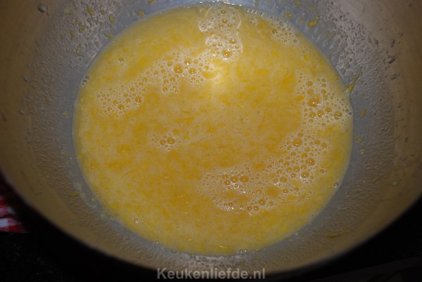 Meng in een kom de ingrediënten voor het citroenlaagje met de mixer door elkaar maar roer niet langer dan nodig is.