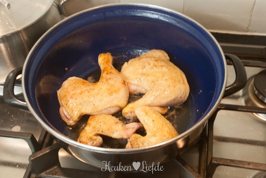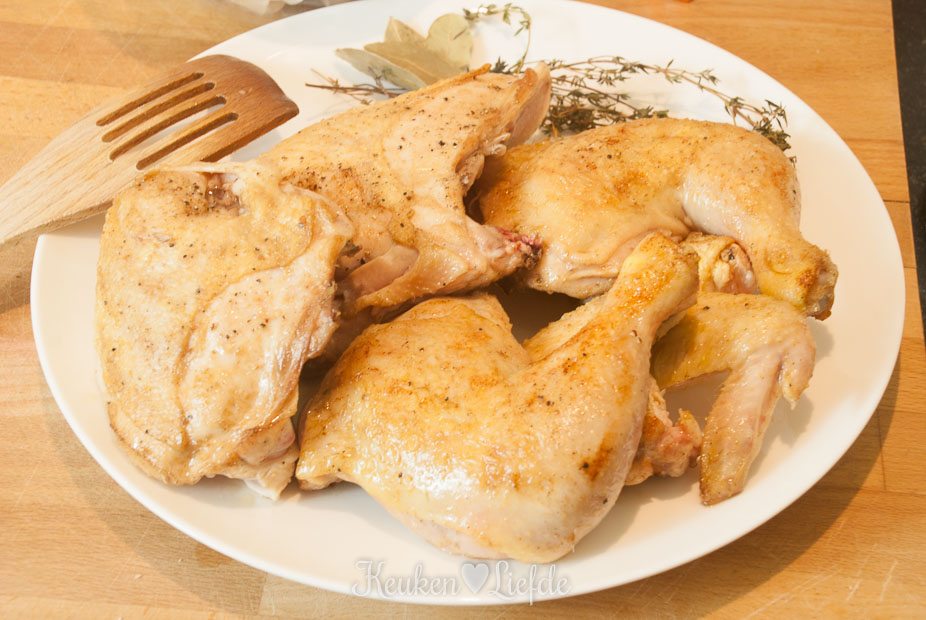 Breng het vocht aan de kook en zet de pan op een heel laag pitje (gebruik een sudderplaatje als je geen sudderstand op je fornuis hebt). Het vocht moet heel zachtjes pruttelen, maar mag niet koken! Doe de deksel op de pan (leg hem iets schuin, anders gaat het vocht alsnog koken) en stoof de kip in circa 1 tot 1,5 uur gaar. Het vlees moet makkelijk van het bot loslaten, maar nog wel mals en sappig zijn.