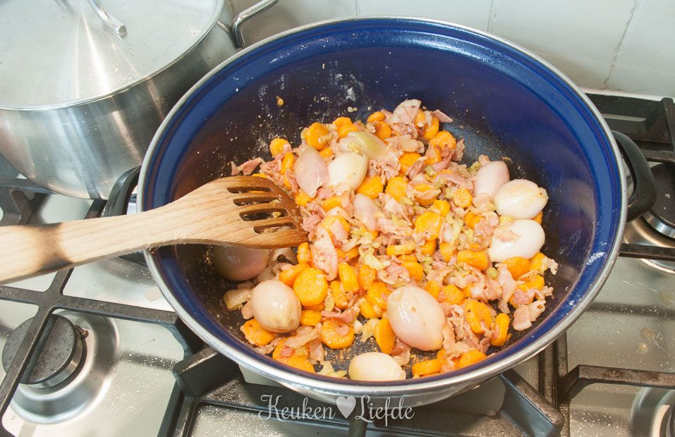 Verhit de pan opnieuw met de rest van de boter en wat olie en voeg het spek, bleekselderij, wortels, knoflook en sjalotjes, totdat ze wat zachter zijn en licht beginnen te kleuren. Voeg de bloem toe en bak even mee om hem te laten garen. Verkruimel de bouillontablet erover.