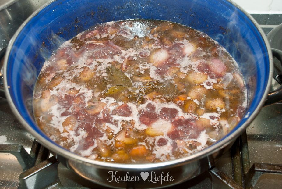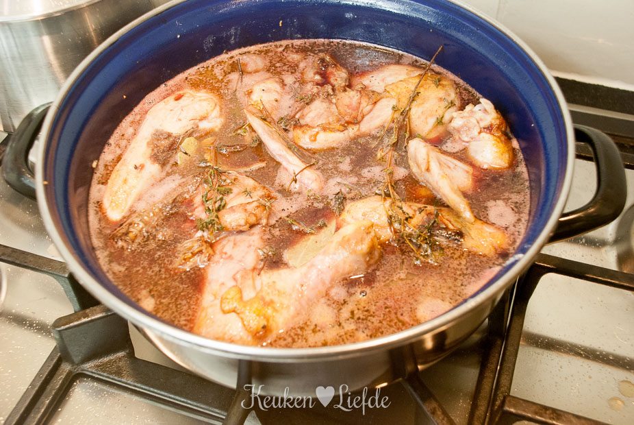 Leg de stukken kip (velkant naar beneden) op de groenten, voeg de tijm en laurierblaadjes toe en giet de rode wijn erbij. Voeg zoveel rode wijn toe, totdat de kip net niet helemaal onderstaat. Voeg ook de gebakken champignons weer toe aan de kip.