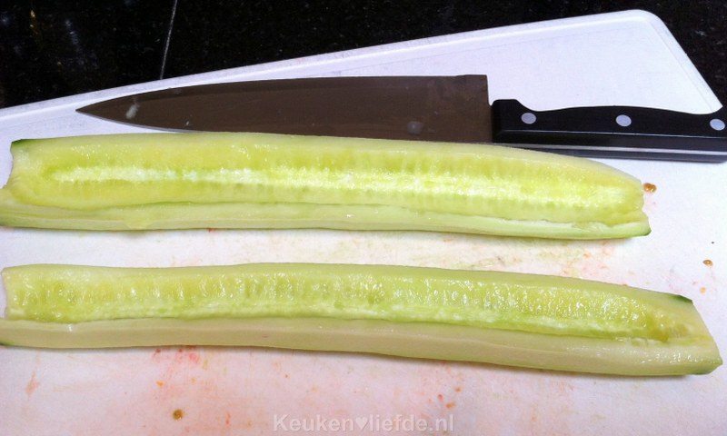 Verwijder het vel van de makreel en trek heel voorzichtig het visvlees van het graat af. Dit gaat op zich heel makkelijk maar doe het wel rustig zodat je geen graatjes mee trekt. Schil de komkommer met een dunschiller en schraap met een lepel de zaadlijsten eruit.