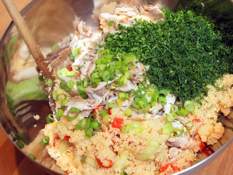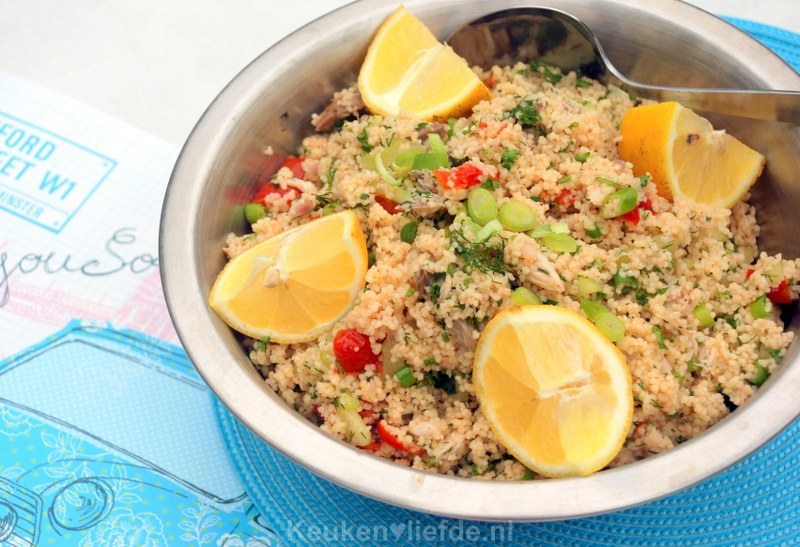 Zodra de bouillon kookt mag het vuur zacht. Als het vocht is opgenomen (dit gaat heel snel!) roer je de lente-ui, verse kruiden, makreel en citroensap door de couscous.