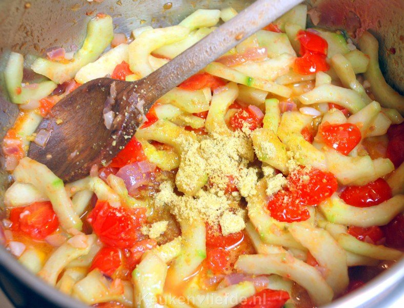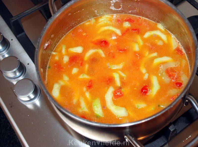 Snijd de komkommer over de lengte doormidden en vervolgens in plakjes. Snijd de lente-ui in ringen en halveer de tomaatjes. Pel en snipper de rode ui en knoflook. Verhit een pan met olijfolie en fruit hierin zachtjes de ui en knoflook zacht. Voeg de komkommer en tomaten toe en bak mee totdat de komkommer wat zachter is. Voeg de couscous toe en verkruimel de bouillontablet erover. Giet er 750 ml water bij en breng dit aan de kook.