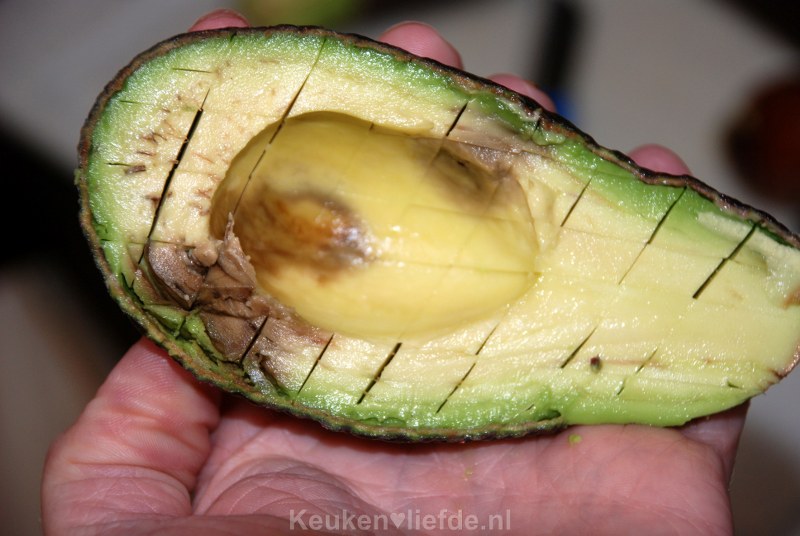 Halveer de avocado en verwijder de pit. Snijd het vruchtvlees in en schep het vervolgens uit de schil.