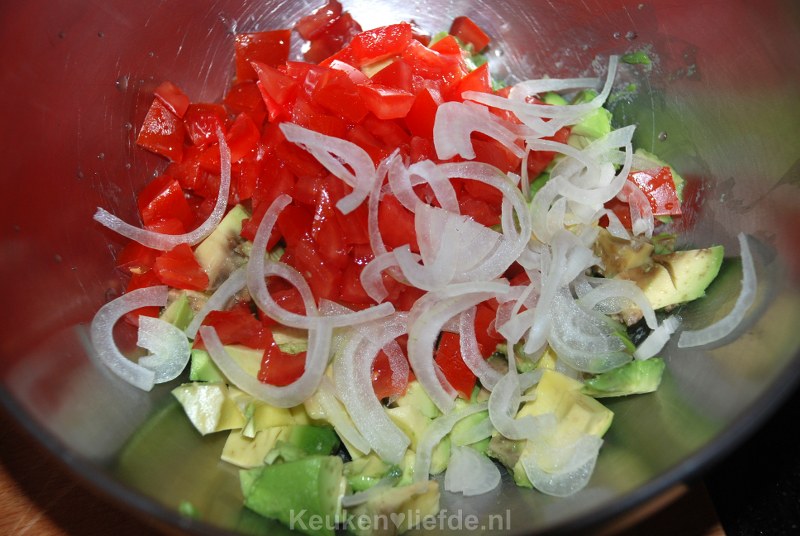 Snijd het sjalotje in dunne halve ringen. Meng de avocado voorzichtig met de tomaat en het sjalotje en breng de salsa verder op smaak met citroensap, olijfolie en zout en peper.