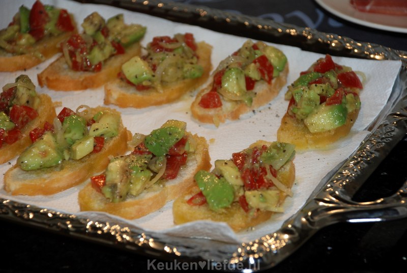 Deze heerlijke crostini met avocado-tomatensalsa kun je serveren als feestelijk aperitief hapje voor een diner of als lekker borrelhapje in het weekend of met de feestdagen.