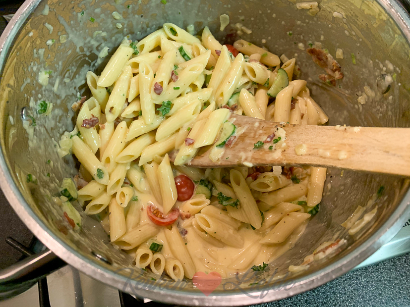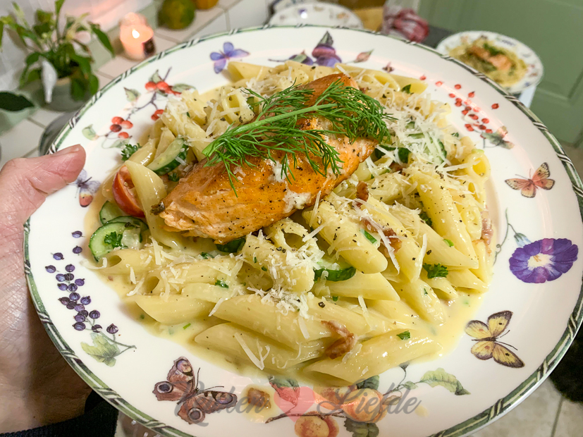 Johan kookt ’s avonds een lekkere pasta carbonara met gebakken zalm.