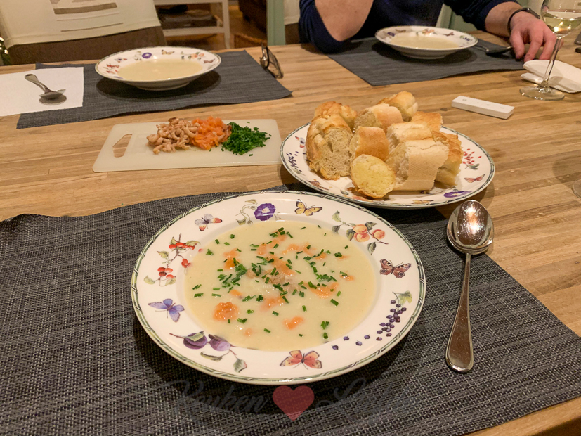 Als we thuiskomen maak ik een simpel bloemkoolsoepje met zalm en Hollandse garnalen. Stokbroodje erbij en smullen maar!