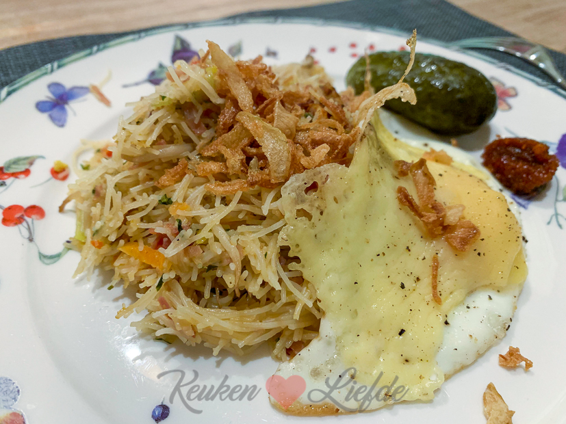 ’s Avonds hoef ik niet te koken. Er is nog een kliekje mihoen over van afgelopen zaterdag dus die bak ik op. Gebakken eitje erbij en smullen maar.