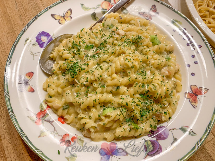 Ik zit ondertussen op kantoor om recepten uit te schrijven voor de website en het nieuwe KL-kookboek en foto’s te bewerken. ’s Avonds eet Johan nog een keer Chinees en ik maak een bordje pasta voor mezelf. Er ligt namelijk al heel lang een zakje pasta carbonara van Knorr in de kelder en daar had ik zo’n zin in. Hallo guilty pleasure! ✋?Om me wat minder schuldig te voelen voeg ik altijd verse ingrediënten toe… ? Het Chinese eten dat over was ging in de vriezer.