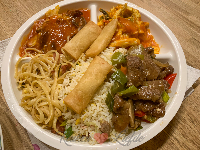 Als Johan zijn ouders weer naar huis gaan, nemen ze Ella-Marie mee om een nachtje te logeren. Johan en ik vermaken ons de rest van de middag op kantoor. ‘ s Avonds hebben we allebei geen zin om te koken, dus halen we een Chinese rijsttafel. We bestelden het maandmenu voor twee personen met babi pangang, foe yong hai en kipsaté, een extra bak ossenhaas in oestersaus en daarbij een bak mihoen. En we bestellen extra mini loempia’s erbij, die dingen zijn verslavend lekker! PS Mocht je zin hebben om zelf een rijsttafel te maken, hier vind je recepten voor babi pangang, foe yong hai, kipsaté, bami goreng, nasi goreng, mihoen goreng en biefstuk in oestersaus. Leef je uit! 🙂