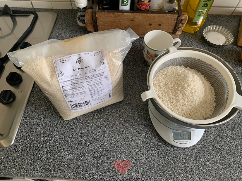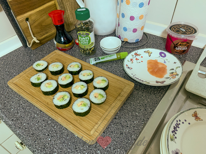 Na al dat gebak was het tijd voor sushi! Daarvoor haal ik het grote geschut uit de kelder: een zak sushirijst van 5 kg en onze sushi bazooka (geweldige uitvinding!). Geen halve maatregelen hier in huize Verweij. Ik bereidde overigens maar 500 gram voor de sushi van vanavond. Daar maakte ik vijf rollen sushi van maar ik had nog rijst over dus had er makkelijk zes rollen mee kunnen maken. Ik vulde de sushi met zelfgemaakte teriyaki zalm (zalm op lage temperatuur garen in een diepvrieszak (mi cuit) in pan heet water, of in de oven in ovenschaal met scheut sojasaus, lepeltje rijstazijn, lepeltje honing, drupje sesamolie, teentje uitgeperste knoflook en mespuntje gemberpoeder of geraspte gember) avocado, Japanse mayonaise en sesamzaadjes: onze favoriet!