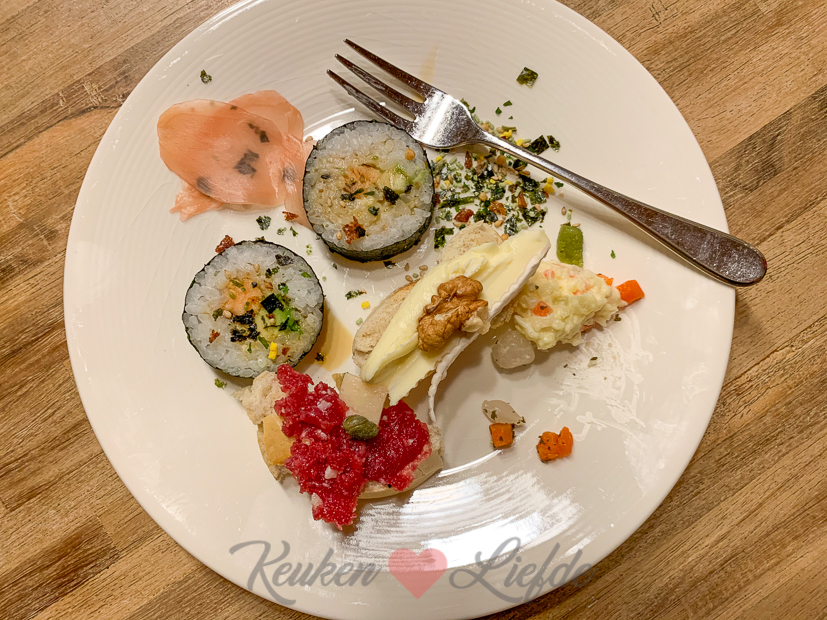Op oudjaarsavond maken we traditiegetrouw een klein buffetje om de hele avond van te snoepen. Dit keer bestond het buffet uit kipsaté (zonder stokje want die waren op), pindasaus en cocktailsaus, eischoteltje, carpaccio tapenade, brie, walnoten en honing, beenham uit de oven, sushi en stokbrood.