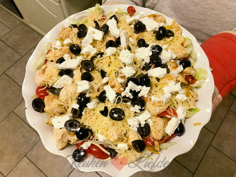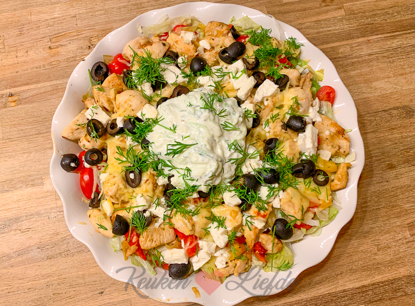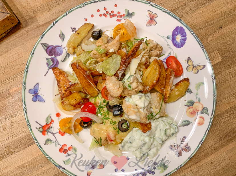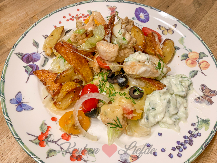 ’s Avonds kookt Johan en dat is feest! Op het menu staat een Griekse kapsalon: een ovenschaal met laagje ovenaardappeltjes (wij maken ovenaardappels altijd in de braadslee met dikke bodem met knoflooktenen in de schil, een flinke scheut olijfolie en zeezout uit de molen, dan worden ze goudbruin en knapperig vanbuiten en zacht vanbinnen!), gebakken kipfilet met ui en paprika, rauwkost (witte kool, ijsbergsla en zoete ui), geraspte kaas, feta, olijven en tomaatjes die kort gegratineerd wordt in de oven. Dan afmaken met zelfgemaakte tzatziki, verse dille en smullen maar. Geloof me jongens en meisjes, dit wil je maken. Gruwelijk lekker!