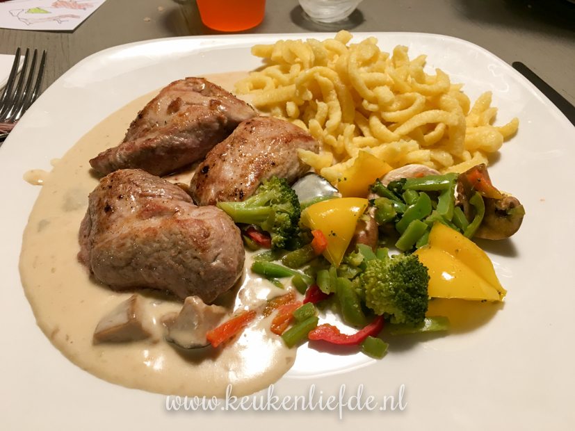 De spätzle met varkenshaas en champignonroomsaus werden door mij verorberd. #goedekeus