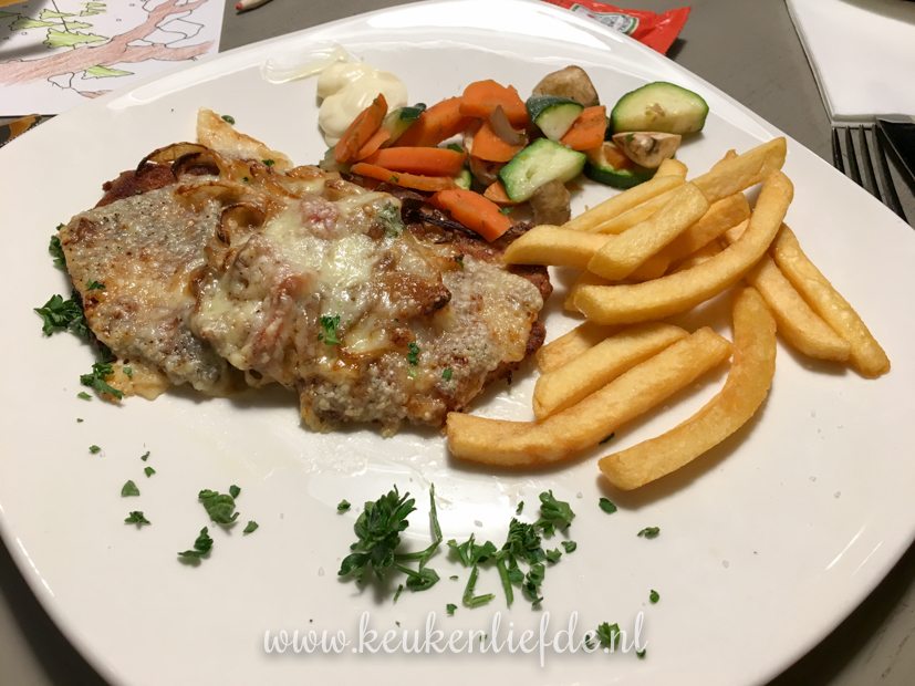 ’s Avonds gaan we uit eten in het parkrestaurant. Het is schnitzelavond dus dat komt goed uit. Wij zijn niet vies van een schnitzeltje.