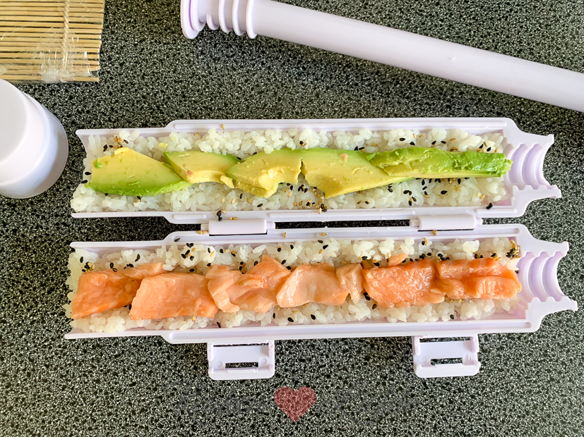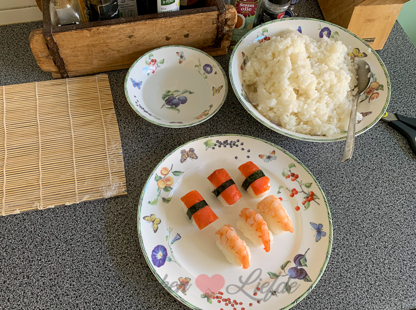 Ik sta ondertussen in de keuken onze favoriete sushi te maken voor vanavond. Sushirollen maak ik tegenwoordig altijd met behulp van de sushimaker. Daarmee maak je heel eenvoudig de perfecte sushirol! Je vindt hem hier in onze shop. Een recept om zelf sushi te maken vind je hier. Tegenwoordig maak ik echter altijd 500 g sushirijst (met 750 ml water) ipv 250 g zoals in het recept staat. Hiermee kun je makkelijk 7 sushirollen maken.