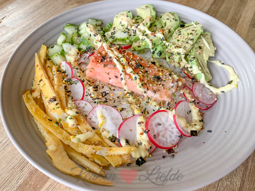 - Sushi bowl met zalm, radijs, komkommer, avocado, omelet, kewpie, furikake en sesam